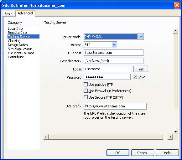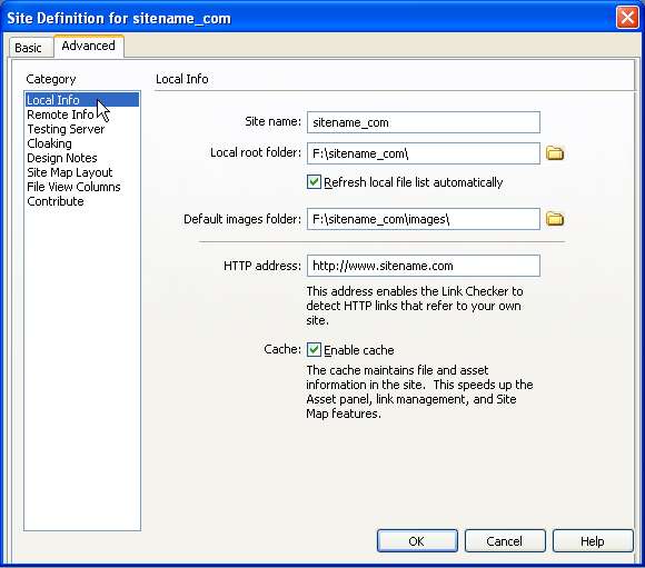 Set local Info -> Site name, local root folder, default images folder and HTTP address