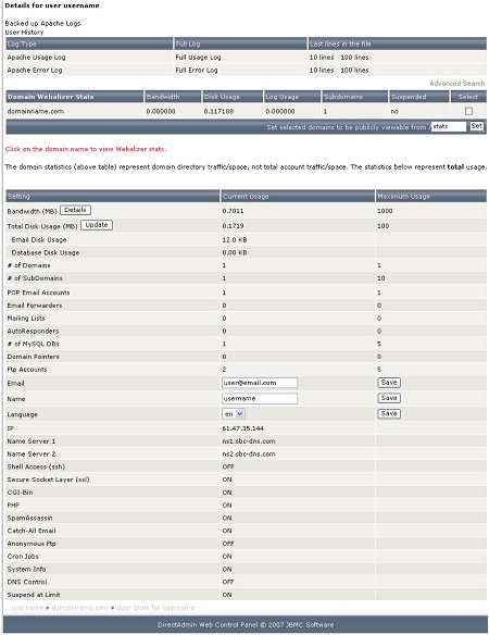 Site Summary / Statistics / Logs provide the detail of statistic for web access analysis and information statistic such as Bandwidth, Hrad Disk. Login to control panel. More information at Direct Admin Introduction