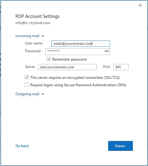 7. Incoming mail at Server change to your info such as mail.yourdomain.com as picture, then press Repair