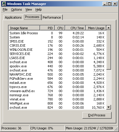 รูปที่ 2 โปรแกรม Task Manager ของระบบปฏิบัติการวินโดวส์ 2000