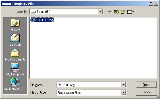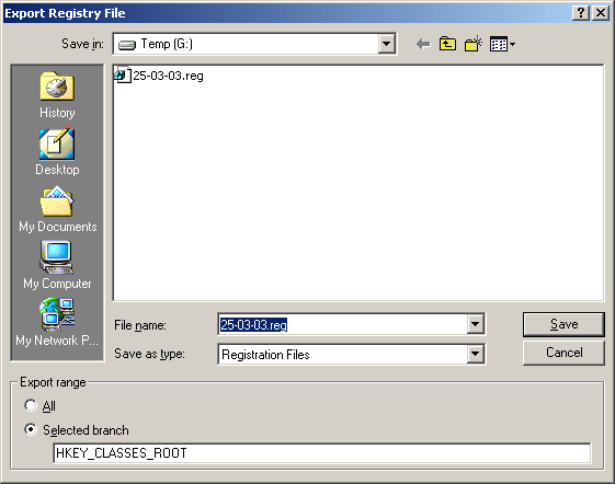 ซึ่งแอพพลิเคชั่นต่างๆ ที่อยู่ในโฟลเดอร์เหล่านี้จะถูกระบบปฏิบัติการวินโดวส์เอ็กซิคิวต์ทันทีที่ระบบเริ่มต้นใช้งาน นอกจากนี้แล้วอีกตำแหน่งที่มี 3-6 เรจิสทรีย์ที่เริ่มต้นใช้งานโดยอัตโนมัติคือในตำแหน่ง HKEY_CURRENT_USERSOFTWAREMicrosoftWindowsCurrentVersion เมื่อเข้าถึงตำแหน่งของเรจิสทรีย์คีย์ที่ได้กล่าวมาแล้ว ให้สังเกตจำนวนแอพพลิเคชั่นที่อยู่ในนั้นเปรียบเทียบกับจำนวนแอพพลิเคชั่นที่ถูกเปิดเมื่อระบบปฏิบัติการเริ่มต้นใช้งาน โดยดูจากจำนวนไอคอนที่อยู่ใน system tray หมายเหตุ system tray อยู่บริเวณมุมล่างด้านขวามือของหน้าจอวินโดวส์ข้างนาฬิกา และจะมีไอคอนเล็กๆ อยู่ในนั้น ถ้าในโฟลเดอร์ HKEY_LOCAL_MACHINESOFTWARE ประกอบด้วยโฟลเดอร์ของโปรแกรมที่น่าสงสัย เช่นสะกดชื่อบริษัทผิดๆ หรือผิดหลักไวยกรณ์ ให้ทำการตรวจสอบดูว่าโปรแกรมดังกล่าวนั้นไวรัสเป็นผู้ทำการติดตั้งหรือไม่ อาจจะอ้างอิงจากคู่มือหรือค้นหาจากอินเทอร์เน็ต เป็นต้น ถ้ามั่นใจว่าโปรแกรมนั้นเป็นไวรัสจริงก็ให้ทำการลบโปรแกรมดังกล่าวนั้นออกจากเรจิสทรีย์ แต่ต้องจำไว้เสมอว่าการแก้ไขค่าในเรจิสทรีย์อาจจะนำมาซึ่งความเสียหายของระบบได้ ต้องใช้ความระมัดระวังให้มาก และก่อนจะแก้ไขควรทำการสำรองเรจิสทรีย์ด้วย อีกหนึ่งหนทางที่ไวรัสใช้ในการกระจายตัวเองได้โดยจะแก้ไขเรจิสทรีย์ที่เกี่ยวข้องกับนามสกุลของไฟล์ทั่วๆ ไป ให้รันด้วยโปรแกรมของไวรัสเอง ตัวอย่างของนามสกุลของไฟล์ทั่วๆ ไปเช่น .EXE .DLL .COM เป็นต้น ซึ่งในระบบปฏิบัติการวินโดวส์นั้นมีเรจิสทรีย์คีย์ที่ชื่อ /HKEY_CLASSES_ROOT สำหรับเก็บค่าว่าไฟล์ที่มีนามสกุลใดให้รันด้วยแอพพลิเคชั่นใด เช่นไฟล์ที่มีนามสกุล .DOC ให้รันด้วยโปรแกรมไมโครซอฟต์เวิร์ด (MS Word) เป็นต้น การสำรองเรจิสทรีย์อยู่เสมอเป็นหนทางที่จะช่วยกู้ระบบคืนหลังจากระบบทำงานผิดพลาดอันเนื่องมาจากการแก้ไขเรจิสทรีย์ผิดพลาด ทั้งนี้อาจจะมีสาเหตุจากไวรัสแก้ไขเองหรือผู้ใช้เป็นผู้แก้ไขเอง วิธีการในการสำรองเรจิสทรีย์โดยการส่งค่าเรจิสทรีย์ออกมาเก็บไว้เป็นไฟล์ หรือเรียกว่าการ export นั่นเอง ทำได้โดยเลือกเมนู Registry -> Export Registry File ดังรูปที่ 5 จะปรากฏไดอะล็อกดังรูปที่ 6 จากนั้นจึงทำการป้อนชื่อที่จะบันทึกแล้วกด Save เป็นอันเสร็จขั้นตอนการสำรองเรจิสทรีย์ เมื่อทำการสำรองเรจิสทรีย์แล้วการเรียกเรจิสทรีย์ที่สำรองไว้มาใช้งานทำได้โดยเลือกเมนู Registry -> Import Registry File ดังรูปที่ 7 และจะปรากฏไดอะล็อกดังรูปที่ 8 แล้วเลือกไฟล์ที่ต้องการจะเรียกใช้ จากนั้นจึงกดปุ่ม Open รูปที่ 5 แสดงการ Export เรจิสทรีย์ รูปที่ 6 แสดงไดอะล็อกเพื่อเลือกไฟล์ที่จะใช้สำรองเรจิสทร