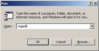 การค้นหาว่ามีไวรัสแอบแฝงตัวอยู่ในเรจิสทรีย์หรือไม่ นั้นจะเริ่มต้นด้วยการเรียกใช้งานโปรแกรมที่ใช้แก้ไขเรจิสทรีย์ โดยกดที่ปุ่ม Start -> Run จะปรากฏไดอะล็อกขึ้น ดังรูปที่ 3 จากนั้นให้พิมพ์คำว่า regedit ในช่อง Open: แล้วเลือกปุ่ม OK จากขั้นตอนนี้จะปรากฏหน้าต่างโปรแกรมที่ใช้แก้ไขเรจิสทรีย์ชื่อ regedit ดังรูปที่ 4