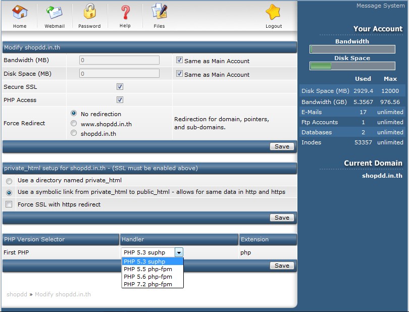 1. ให้ทำการ Login เข้าสู่ Control Panel โดยเข้าผ่าน https://yourdomain.com:2222 ดังรูป 2. เลือกหัวข้อ Domain Setup 3. เลือกโดเมนที่ต้องการเปลี่ยน PHP Version 4. ในส่วนของหัวข้อ PHP Version Selector จะสามารถเลือก Version ที่ต้องการได้แล้วกด Save ดังรูป 5. เป็นอันเสร็จสิ้นการเปลี่ยน PHP Version ดังรูป