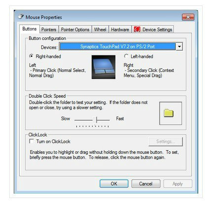 ในส่วนของ Buttons เราสามารถกำหนดได้ว่า จะให้ปุ่มไหนทำงานเป็นปุ่มหลัก คนที่ถนัดมือขวา (คนส่วนใหญ่) เม้าส์ปุ่มซ้าย จะเป็นปุ่มหลัก อย่างเช่นการกดเลือก หรือกดค้างเพื่อลากแล้ววาง ส่วนคนที่ถนัดมือซ้าย สามารถกำหนดปุ่มขวาให้เป็นปุ่มหลัก ส่วนปุ่มซ้ายเป็นการเข้าเมนูย่อย หรือลากแบบพิเศษ นอกจากนี้เรายังสามารถกำหนดค่าต่างๆของเม้าส์ให้เหมาะ สมกับ ความถนัดของเรา