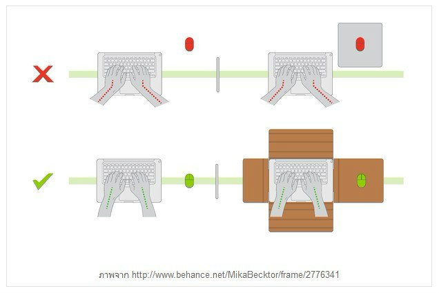 2. กำหนดพื้นที่วางเม้าส์ให้ถูกต้อง หากคุณใช้โต๊ะวางคอมพิวเตอร์ขนาดเล็ก (เช่น 80 เซ็นติเมตร) อาจจะมีพื้นที่วางคีย์บอร์ด แต่ไม่มีพื้นที่วางเม้าส์ ทำให้ต้องวางไว้เม้าส์บนโต๊ะแทน เป็นสาเหตุให้คุณปวดแขน ปวดไหล่ แถมยังร้าวไปถึงคอได้อีก ควรวางเม้าส์ข้างซ้ายหรือขวา ตามแขนข้างที่ถนัด ใกล้คีย์บอร์ด และอยู่ในองศาที่จับถนัดมือโดยไม่ห่อไหล่ หรือผู้ผลิตอย่าง The Green Case ได้จัดทำผลิตภัณฑ์ที่ช่วยกำหนดพื้นที่ในการวางเม้าส์ และการวางมือให้เหมาะสมดังภาพ